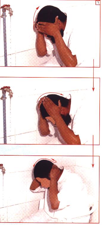 بيديه إلى مؤخرة رأسه ثم يعود إلى مقدمة رأسه مرة أخرى